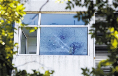 中國音樂學院女生宿舍2號樓東面臨街,馬路對面是安翔里社區(qū)。昨天上午11時,事發(fā)宿舍的陽臺玻璃上,仍然清晰可見兩個手指粗的洞孔,洞孔四周的玻璃呈放射狀碎裂,兩個圓孔相距不到20厘米。