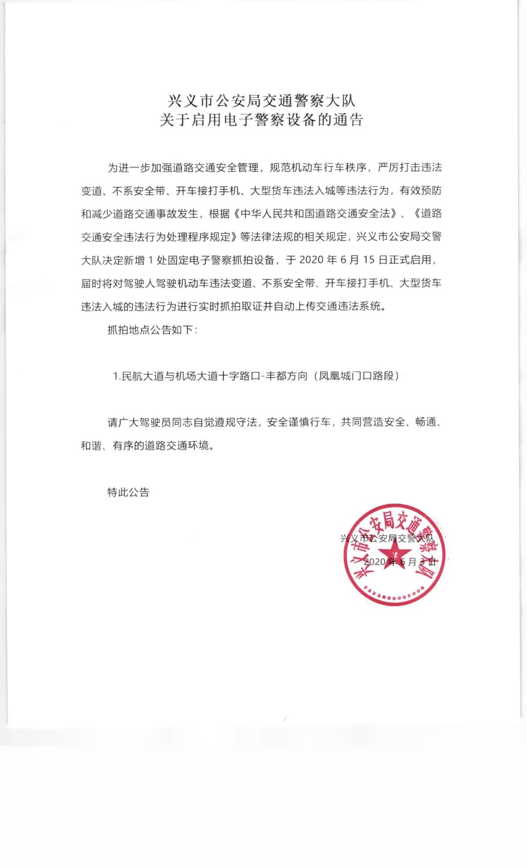 - 興義市公安局交通警察大隊關于啟用電子警察設備的 2020-03-23 22:24:59