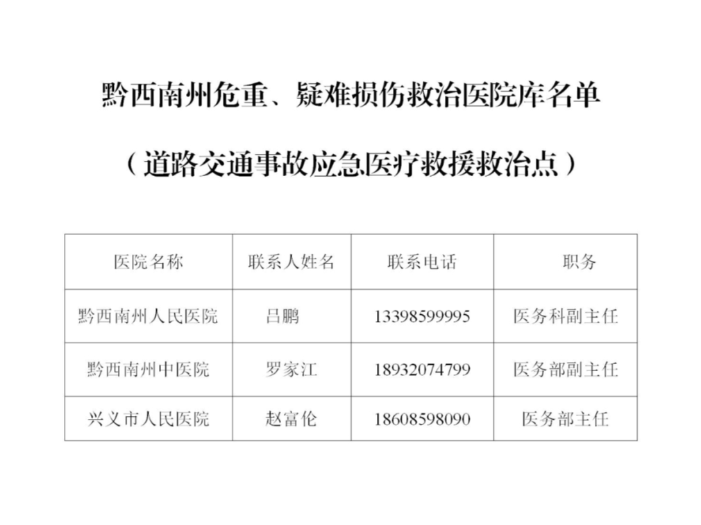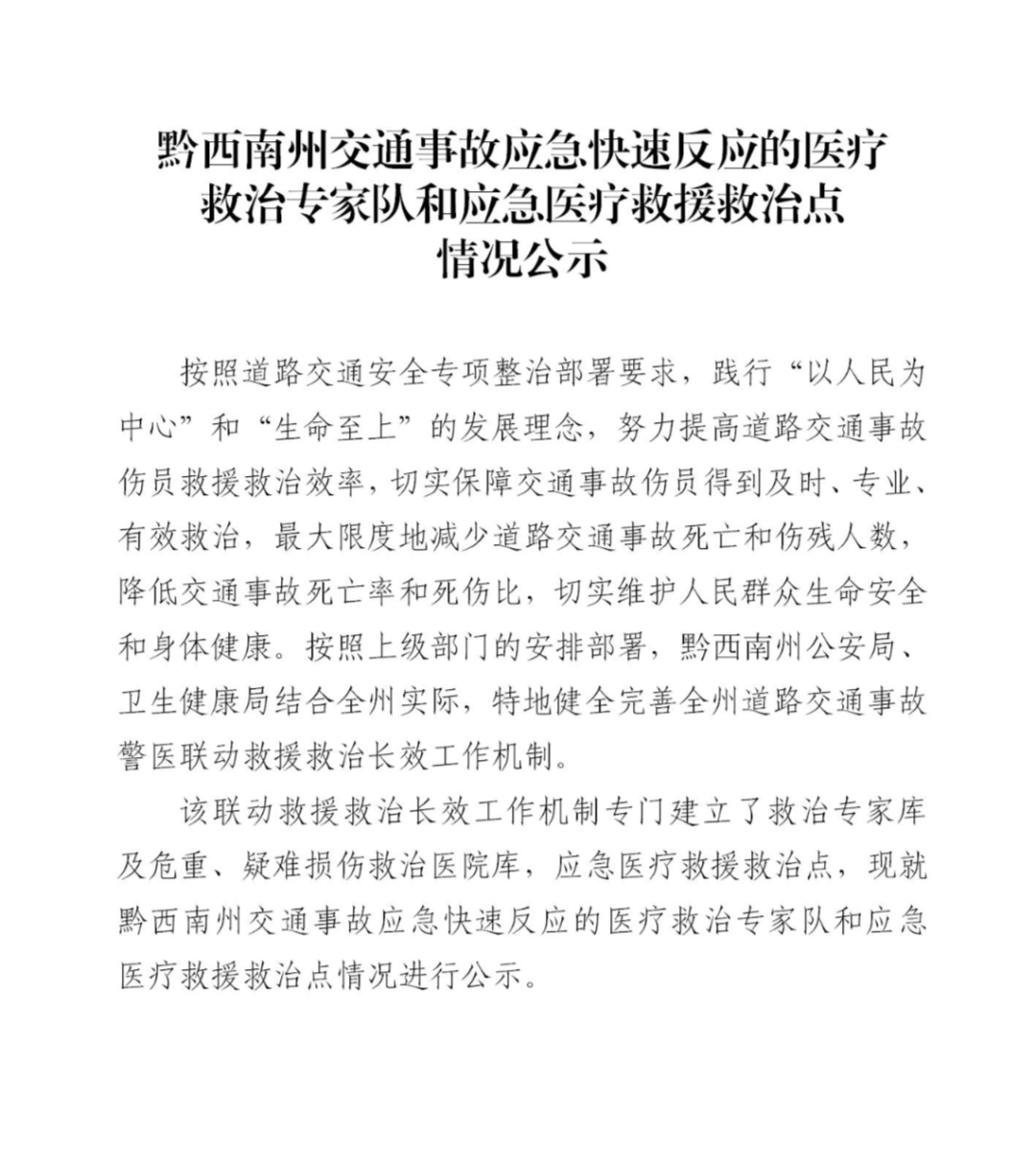 黔西南州交通事故應(yīng)急快速反應(yīng)的醫(yī)療救治專家隊(duì)和應(yīng)急醫(yī)療救援救治點(diǎn)情況公示