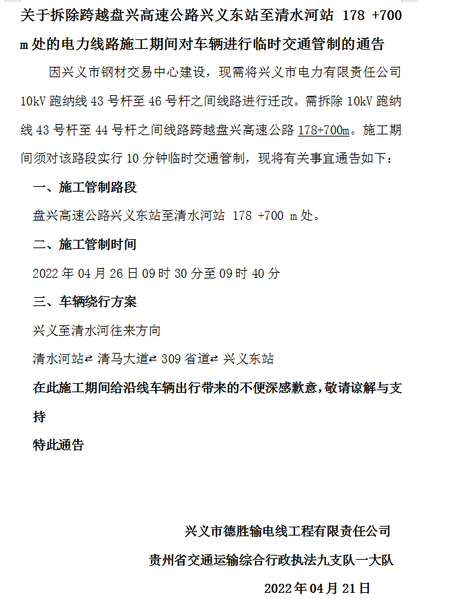 關(guān)于拆除跨越盤興高速公路興義東站至清水河站178 +700 m處的電力線路施工期間進(jìn)行臨時(shí)交通管制的通告