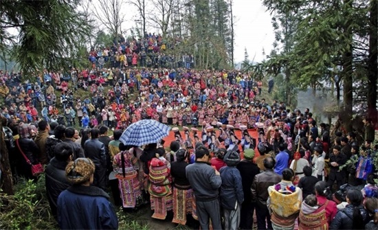 來到新寨寨口,多才多藝的苗胞身著盛裝站在道路的兩旁,她們用《姹娜、姹娜》《敬酒歌》迎接客人的到來。