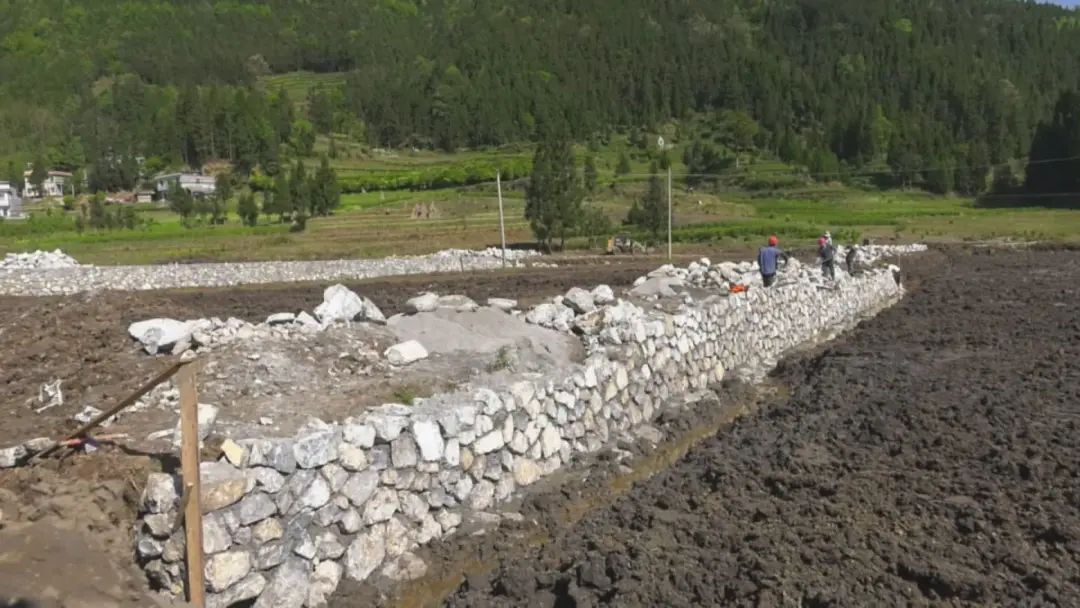 走進白石村申關(guān)屯組,田間地頭一派繁忙景象。施工人員正在砌筑田埂,施工機械往返忙碌,確保在5月底前完成100余畝的水田小塊改大塊工作。