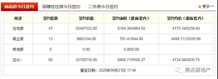日簽約量 截止時(shí)間2020年8月21日17:49,興義市區(qū)的新房總簽約量為60套。其中住宅用房簽約47套,簽約金額25487522.00元,簽約面積(建面)6104.30㎡;均價(jià)(建面)4175.34元/㎡(較8月21日住宅建面簽約均價(jià)4041.31元/㎡元/m²增加134.03元/m²);商業(yè)用房成交13套,成交面積(建面)701.41㎡,成交金額6663194.00元,均價(jià)(建面)9499.71元/㎡;其他房成交0套。