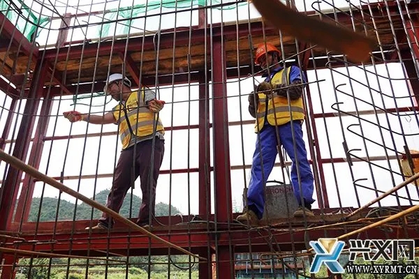 圖為峽谷村特大橋施工現(xiàn)場工人正在捆扎鋼筋