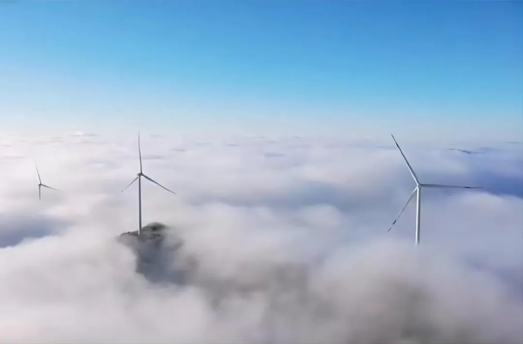一座座風(fēng)機(jī)矗立在茫茫云海間,若隱若現(xiàn),顯露出高挑的身姿,猶如一位亭亭玉立的少女,簡約而又美麗。