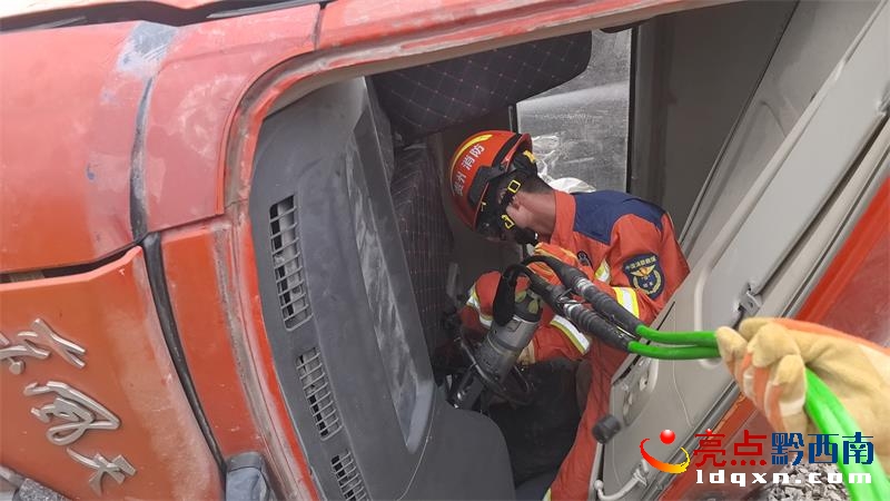 貨車側(cè)翻一人被困 興義消防緊急救援