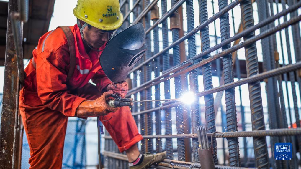 貴州公路集團(tuán)工人在花江峽谷大橋5號(hào)主塔進(jìn)行施工(8月3日攝)。