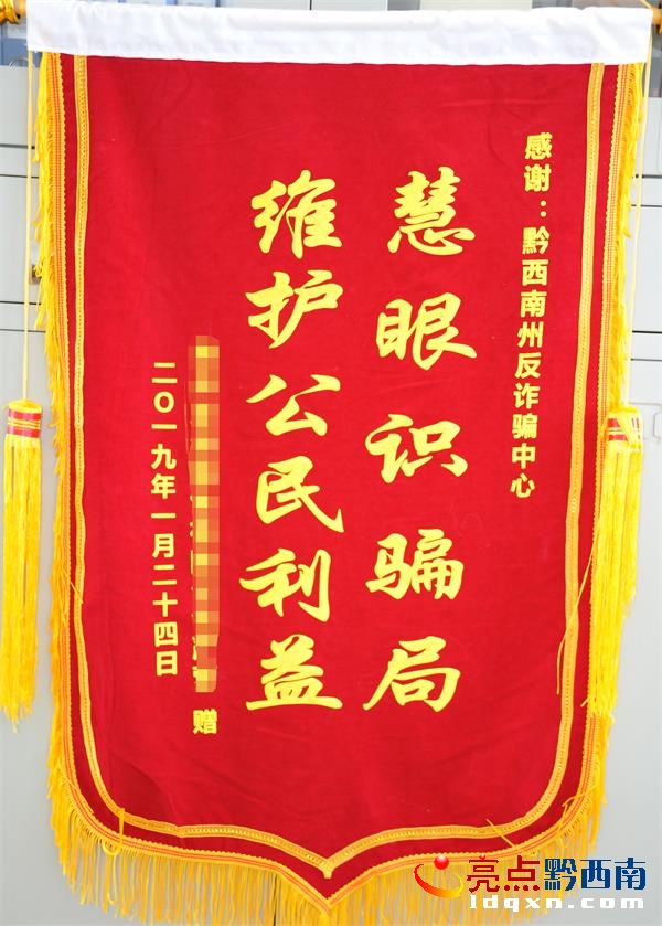 2月21日,家住黔西南州興義市桔山鎮(zhèn)的嚴女士專門趕到黔西南州反詐騙中心,對反詐中心為其追回被騙資金表示感謝,特地為反詐中心送來了“慧眼識騙局,維護公民利益”的錦旗。